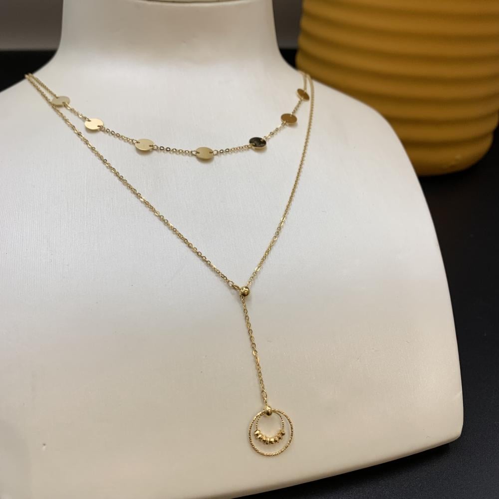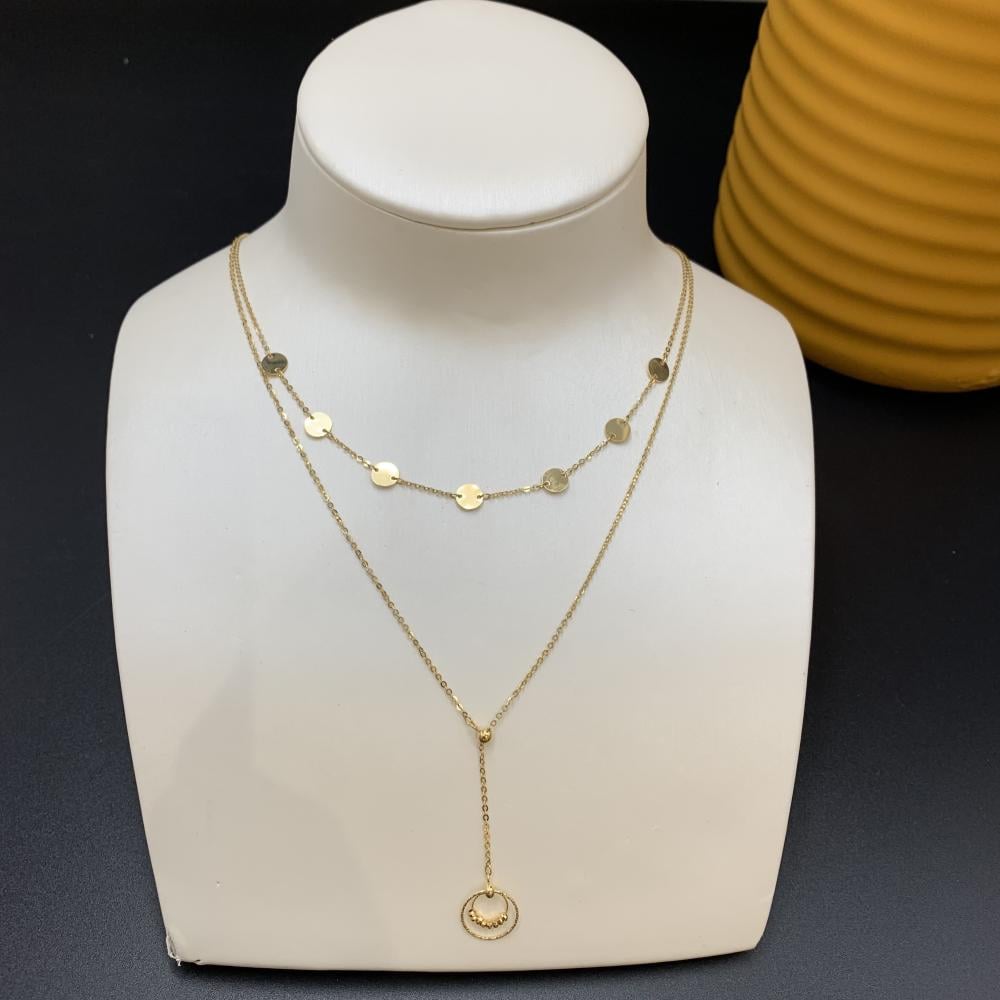 يتميّز العقد بطبقتين متناغمتين تنسدل برقة على الرقبة، ما يمنح مظهرًا غنيًا ومفعمًا بالأناقة دون أي تعقيد. التصميم الإيطالي الكلاسيكي يضمن لكِ قطعة تدوم في الذوق والقيمة، وتُكمل إطلالتك سواء أكنتِ في مناسبة رسمية أو ترتدينها بأسلوب يومي عصري.